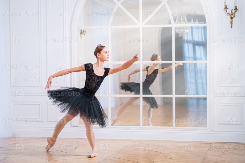 Молодая балерина в черной пачке стоит в изящной позе на пуантах в большом светлом зале перед зеркалом