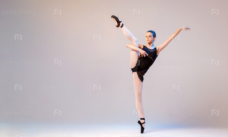 Молодая балерина в черном купальнике и пуантах танцует на ярком фоне