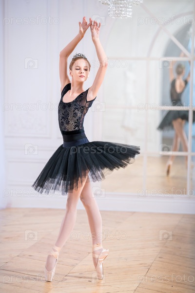 Юная балерина в черной пачке танцует на пуантах в большом светлом зале перед зеркалом