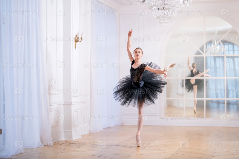 Юная балерина в черной пачке танцует на пуантах в большом светлом зале перед зеркалом