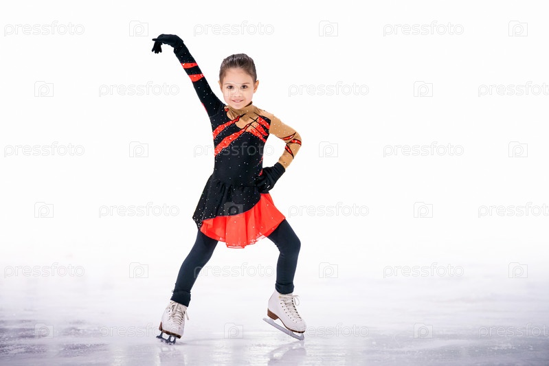 Маленькая фигуристка в красном черном красивом платье с улыбкой катается на коньках по льду на крытом катке