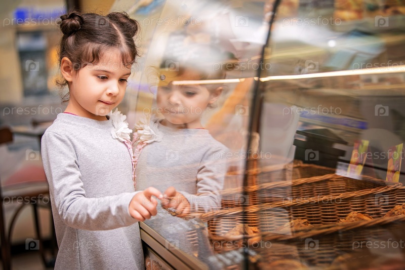 Маленькая девочка стоит у окна в кафе и выбирает булочки и пирожные