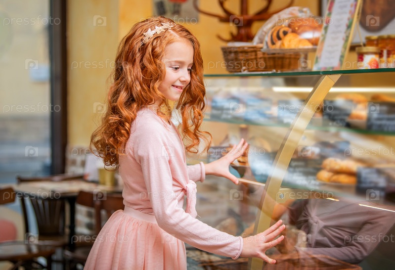 Милая маленькая рыжеволосая девушка выбирает пирожные у стеклянного окна в кафе