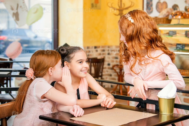 Дети в кафе за столом выбирают, какие сладости заказать. Рыжая девушка слушает подруг