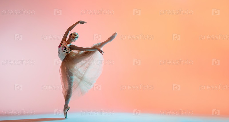 Балерина в светлом платье танцует на цветном фоне с подсветкой