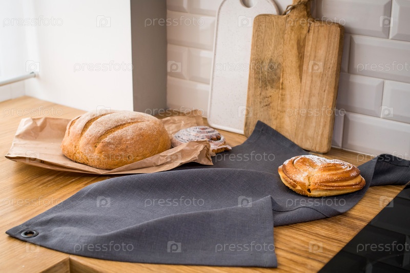 Свежая буханка хлеба, лежащая на льняном полотенце на деревянном столе