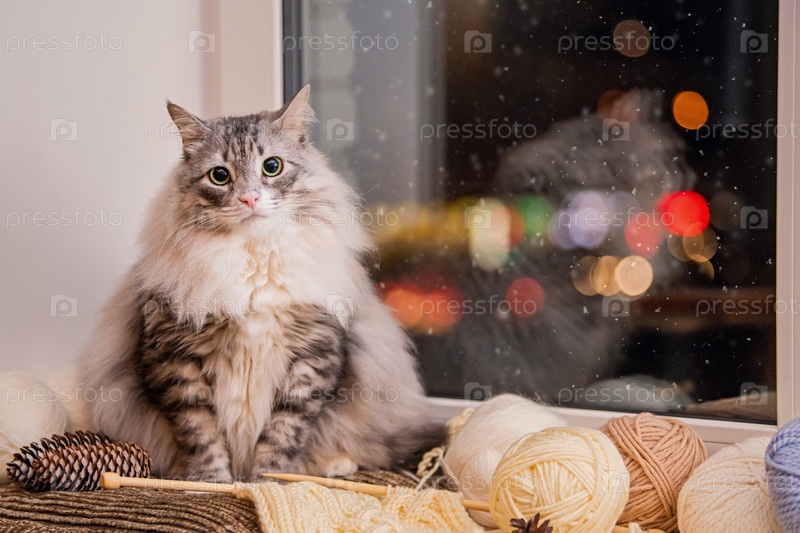 Серый толстый пушистый кот сидит на подоконнике среди клубков пряжи на фоне снега, идущего за окном в ночном небе