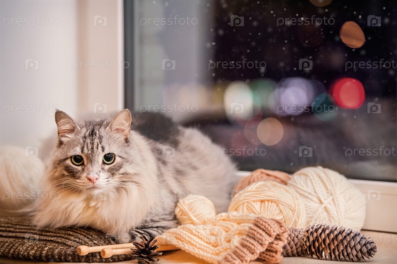 Серый толстый пушистый кот сидит на подоконнике среди клубков пряжи на фоне разноцветного боке в ночном небе