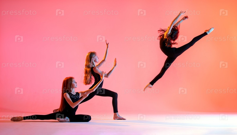 Группа из трех балеток с длинными распущенными волосами в черных обтягивающих костюмах танцует на красном фоне