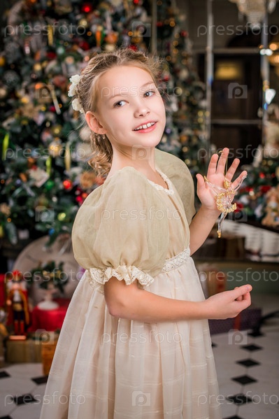 Хорошо одетая маленькая девочка дома танцует вокруг елки