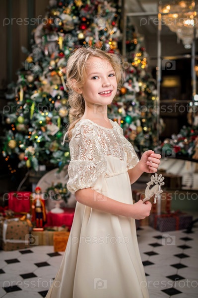 Хорошо одетая маленькая девочка дома танцует вокруг елки