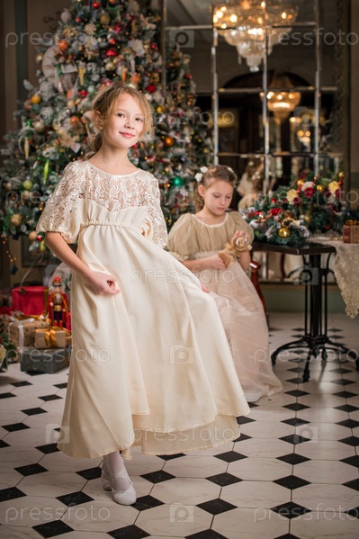 Хорошо одетая маленькая девочка дома танцует вокруг елки