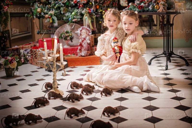 Две сестры в красивых элегантных платьях сидят на полу в роскошном винтажном интерьере возле рождественской елки