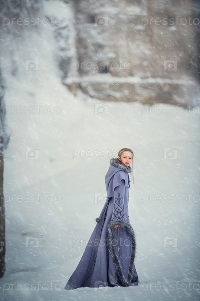 Сказочная девушка-эльф гуляет возле древней крепости и заснеженной зимней природы