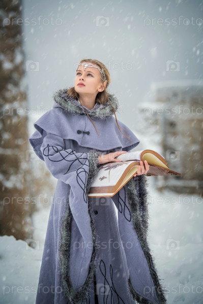 Портрет сказочной эльфийки с волшебной книгой в руках на фоне зимней природы и волшебной крепости