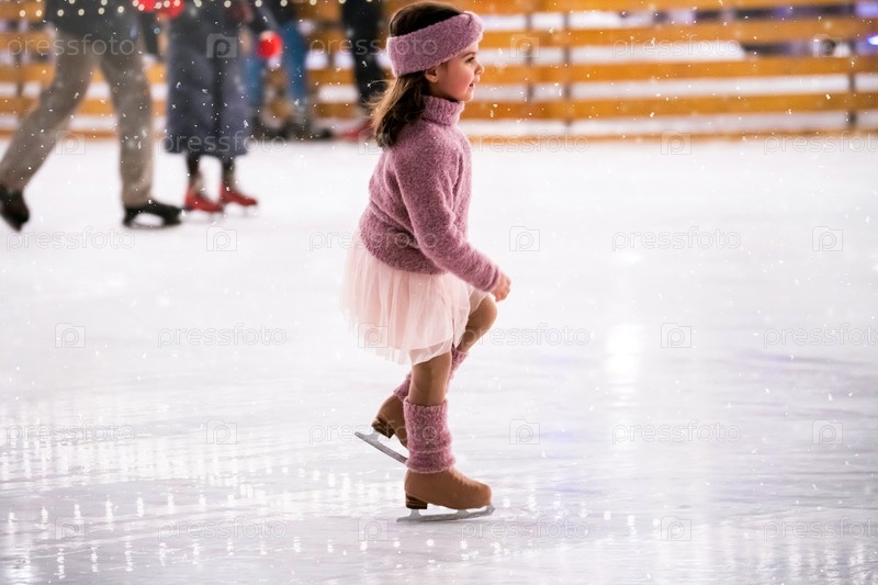 Маленькая девочка в розовом свитере катается зимним вечером на открытом катке, освещенном гирляндами