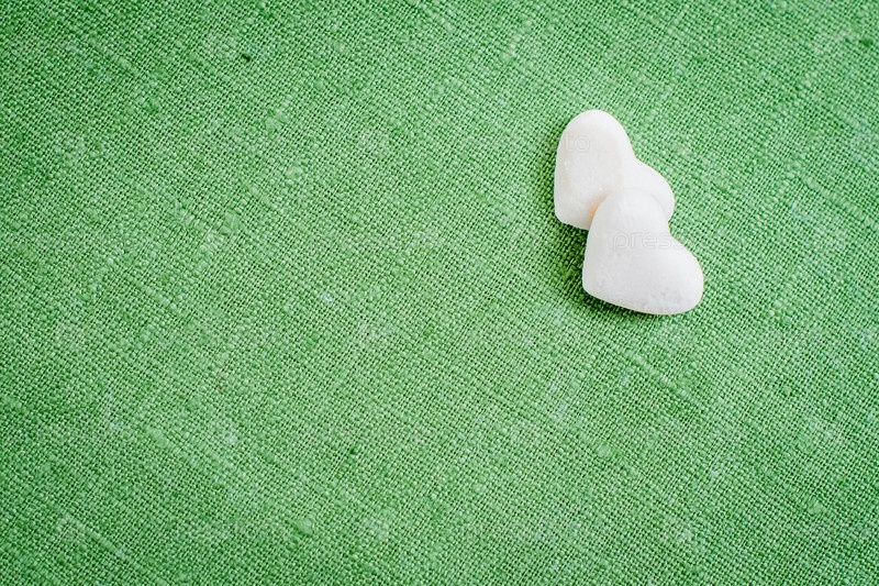 Сердца из рафинированного белого сахара лежат на зеленой льняной ткани