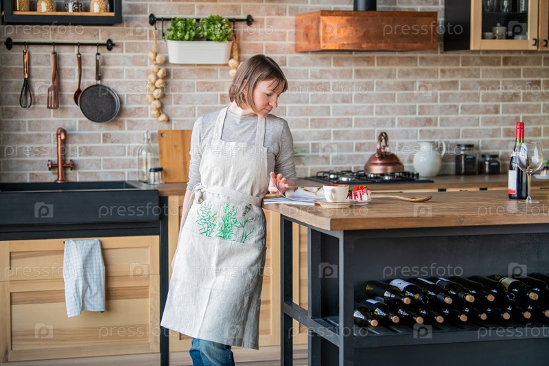 Счастливая женщина в льняном фартуке, стоящая на кухне за столом, изучает журнал