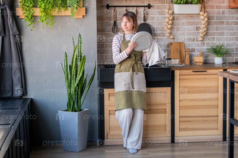 Счастливая женщина в льняном фартуке стоит на кухне у раковины и вытирает тарелку льняным полотенцем