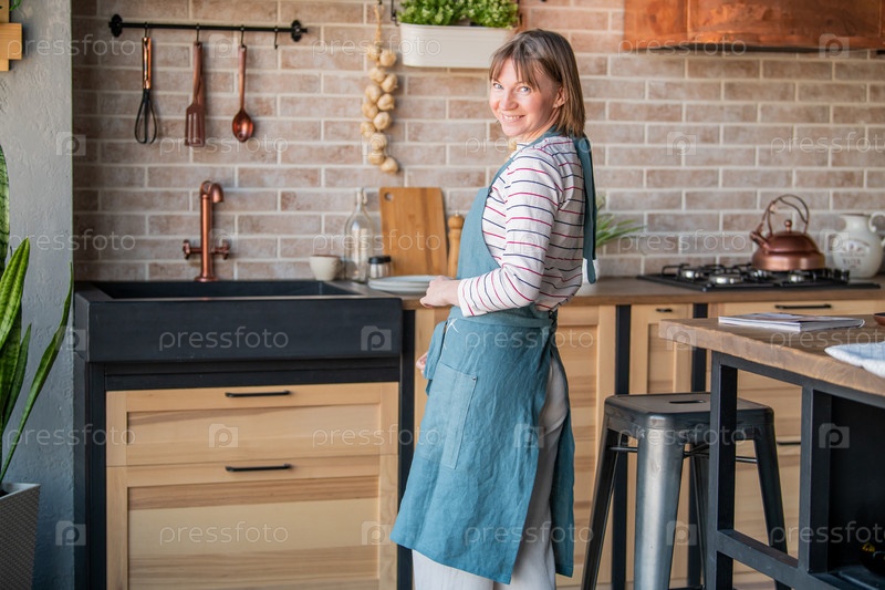 Счастливая женщина в льняном фартуке, стоящая на кухне за столом, с улыбкой оборачивается