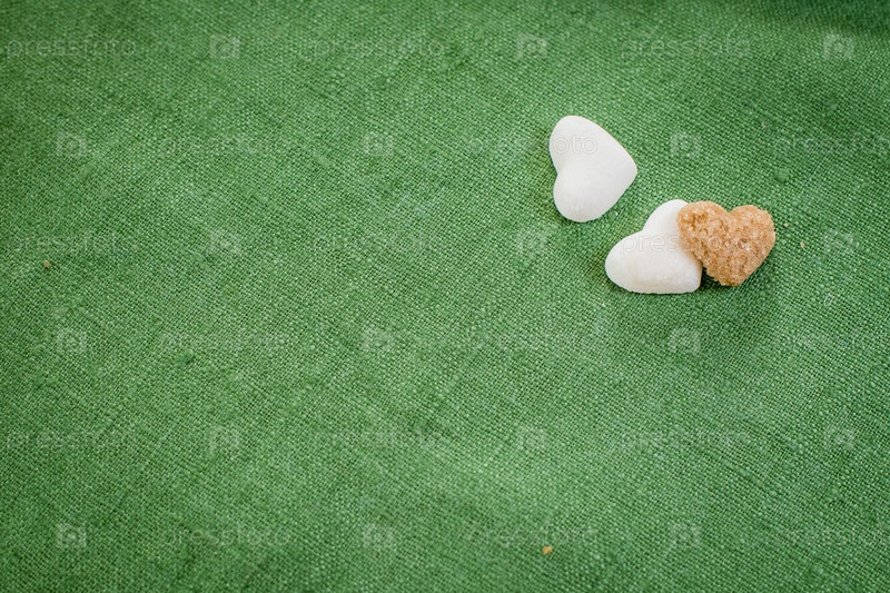 Сердца из рафинированного белого сахара и коричневого сахара лежат на зеленой льняной ткани