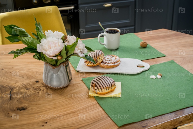 На зеленом льняном полотенце на деревянном столе лежит букет нежных розовых пионов и лежат сладкие булочки