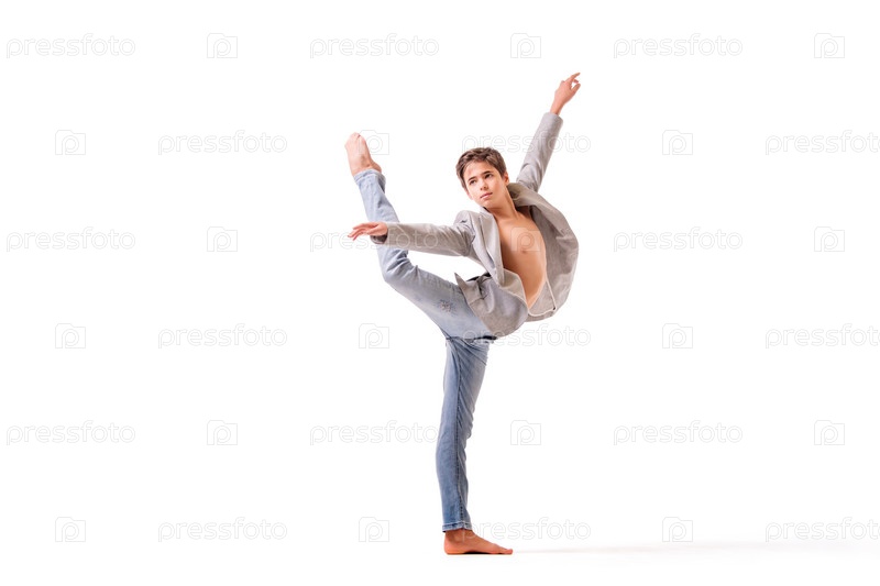 Мальчик-подросток танцор балета прыгает на белом фоне, изолирован