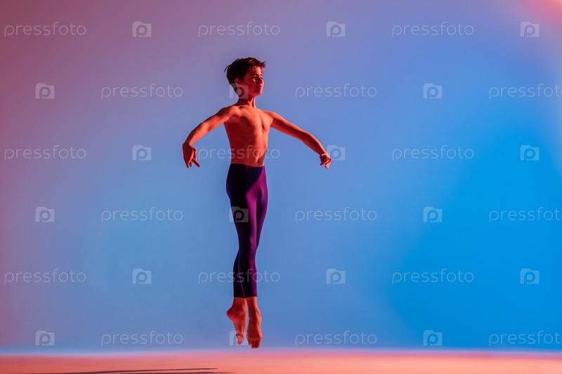 Мальчик танцует босиком под разноцветным светом