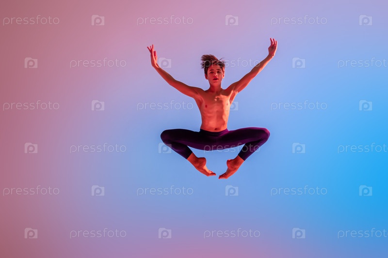 Мальчик-подросток балета прыгает босиком под цветным светом