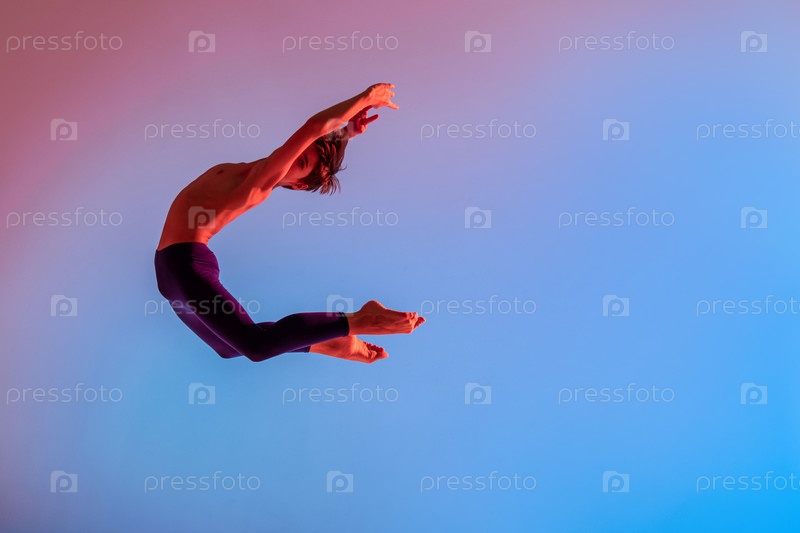 Мальчик-подросток балета прыгает босиком под разноцветным светом
