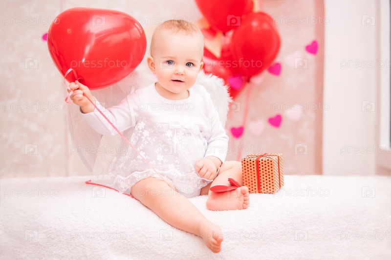 Ребенок с крыльями из белых перьев держит красный шар в форме сердца, символы Дня святого Валентина
