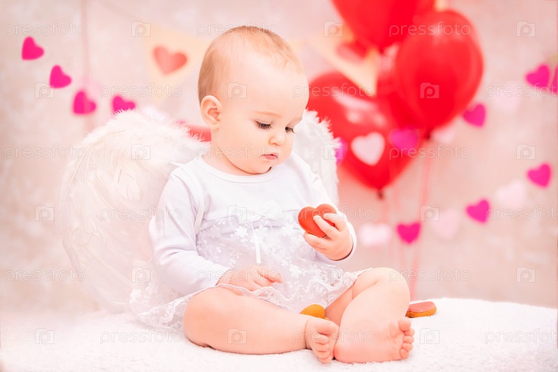 Младенец с крыльями из белых перьев ест печенье в форме сердца, символ Дня святого Валентина