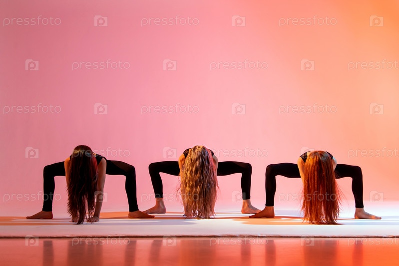 Группа из трех девушек в черных обтягивающих костюмах, танцующих на красном фоне с распущенными длинными волосами