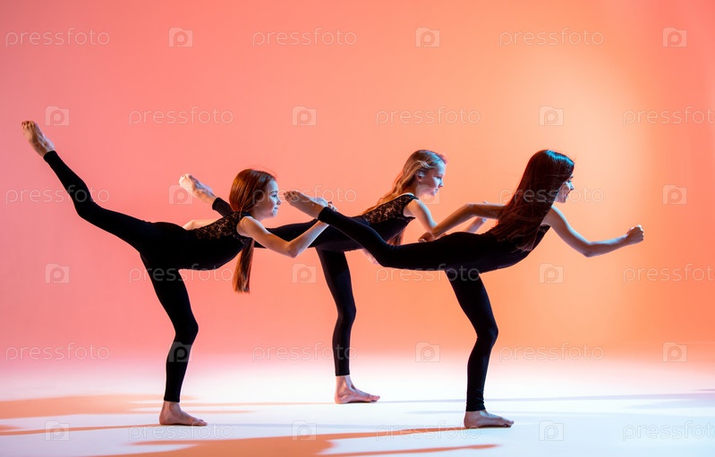 Группа из трех балеток в черных обтягивающих костюмах, танцующих на красном фоне с распущенными длинными волосами