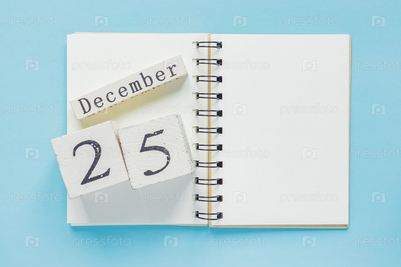25 декабря в деревянном календаре на учебнике на синем фоне. концепция рождества и нового года