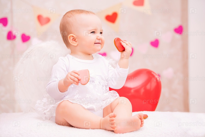 Ребенок с крыльями из белых перьев держит красный шар в форме сердца, символы Дня святого Валентина