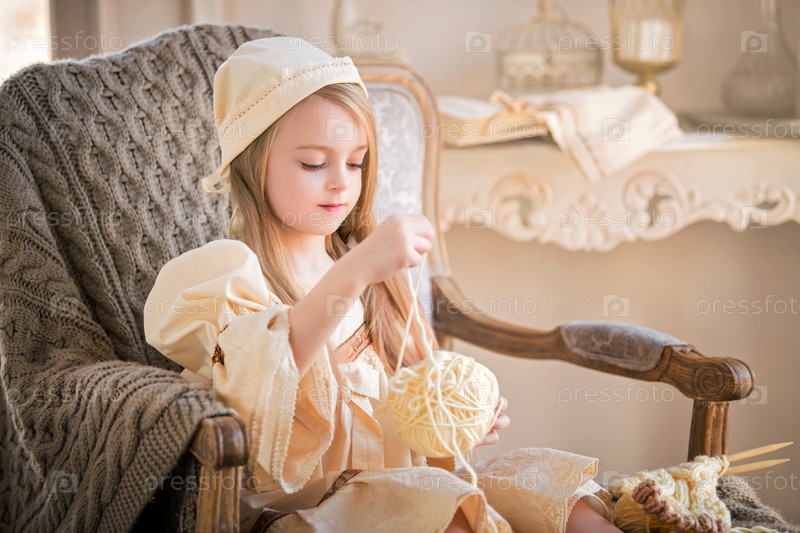 Маленькая блондинка с длинными волосами в ночной рубашке сидит в кресле и наматывает пряжу в клубок