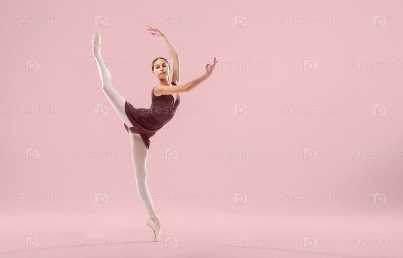 Красивая молодая балерина на белом фоне. Балерина одета в красный купальник, розовые купальники, пуанты