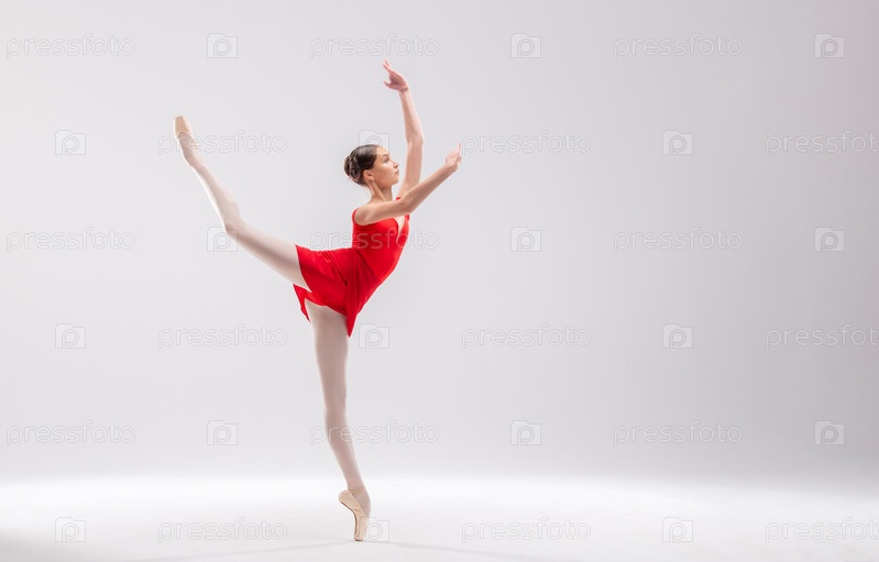 Красивая молодая балерина на белом фоне. Балерина одета в красный купальник, розовые купальники, пуанты