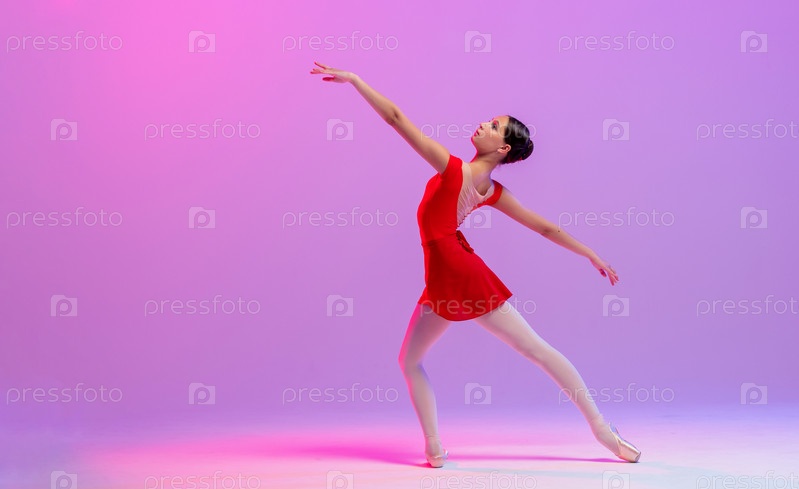 Красивая молодая балерина на белом фоне. Балерина одета в красный купальник, розовые купальники, пуанты