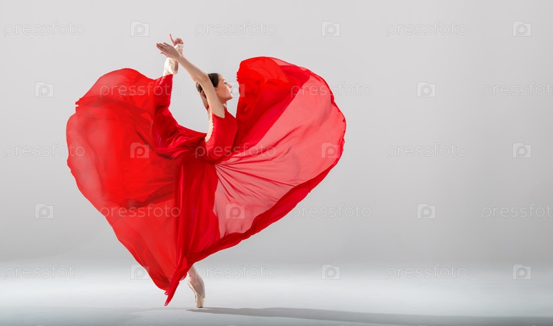 Элегантная балерина в пуантах танцует в длинной красной юбке, развивающейся в форме сердца на белом фоне