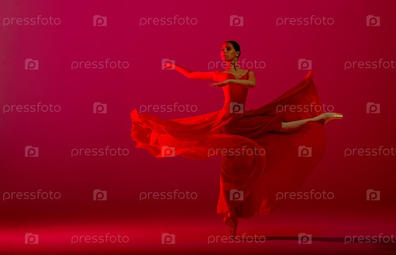 Юная грациозная балерина, одетая в пуанты и невесомую красную юбку, демонстрирует свои танцевальные способности. Красота классического балета
