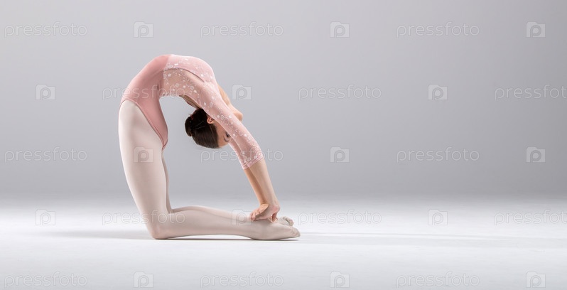 Красивая балерина на белом фоне одета в светло-розовый кружевной купальник, розовые купальники, занимается наземной гимнастикой на полу на белом фоне