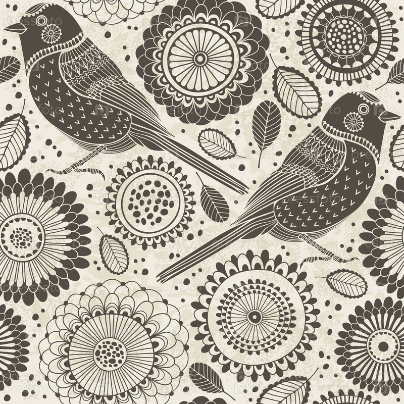 Цветочный бесшовный узор с птицами. Мультфильм Векторный фон