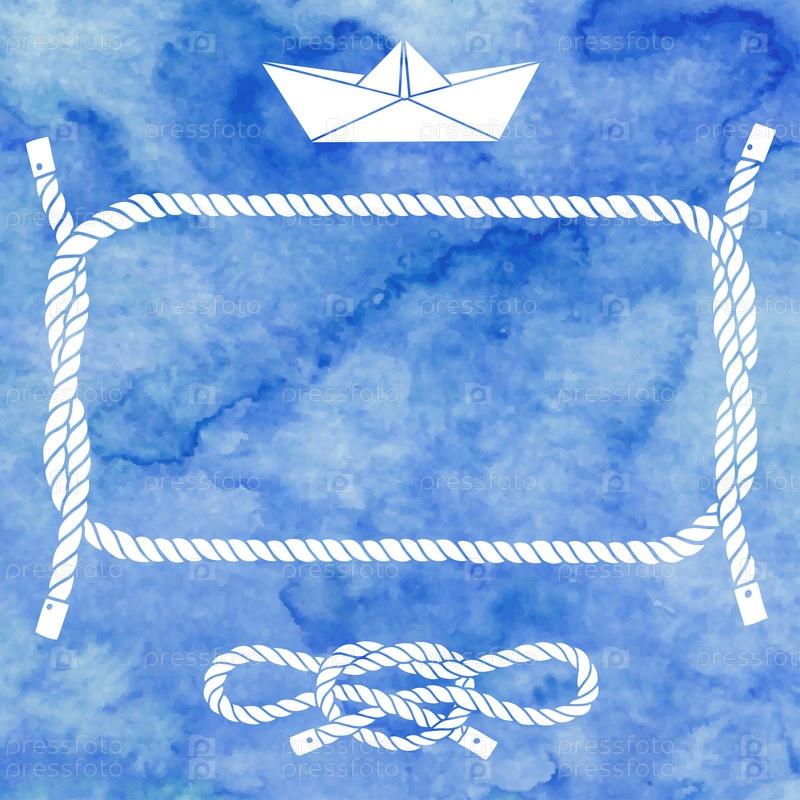 Морская карта с рамкой, морскими узлами и бумажным корабликом на синем акварельном фоне. Векторный фон с пространством для текста