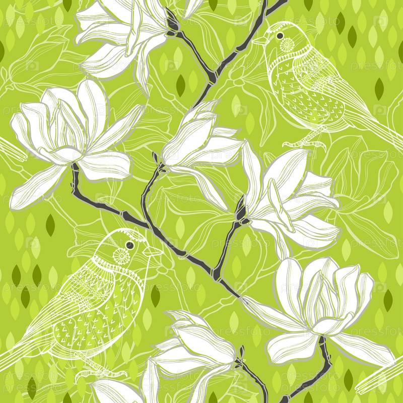 Бесшовный фон с магнолией и птицами. Весенний фон