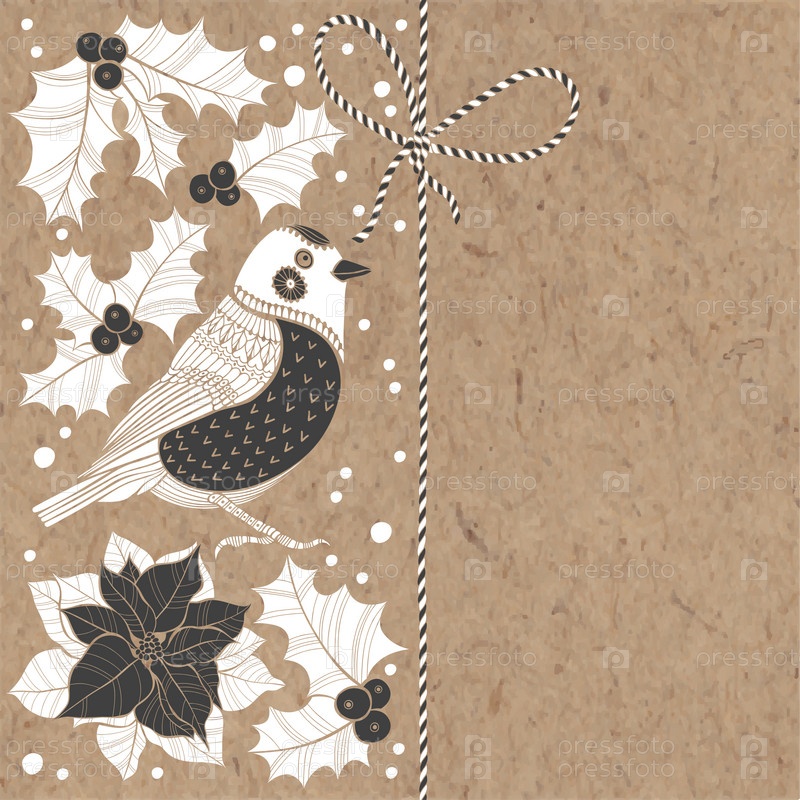 Новогодний фон со снегирем, пуансетией и остролистом на крафт-бумаге. Векторной иллюстрацией могут быть поздравительные открытки, приглашения и элемент дизайна