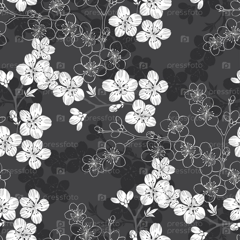 Монохромный бесшовный узор с цветущими ветвями вишни
