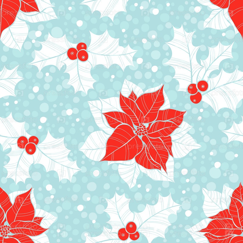 Бесшовный узор с цветами пуансеттии и падубом. Векторный рождественский фон