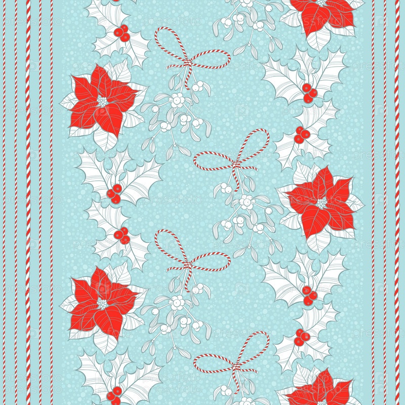 Бесшовный рисунок с цветами пуансеттии, омелой и падубом. Векторный рождественский фон